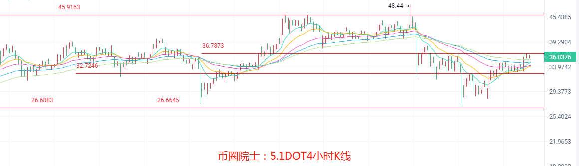 4小时布林带向上开口,K线冲破布林带上轨以后,目前震荡在上轨区间(36.67),KDJ上行开始有收口趋势,MACD放量,DIF和DEA高位上行遇阻力上行减缓,4小时EMA移动平均线,EMA15(34.95)和EMA90(34.95)重合,EMA30(34.21)也开始上行交替EMA60(34.30),交替上行正在进行中,综合判断DOT整体走势偏强,震荡趋势不会延续太久,多单持有的可以继续持有中,行情瞬息万变,勿贪,具体操作以实时策略为主,分析主做参考