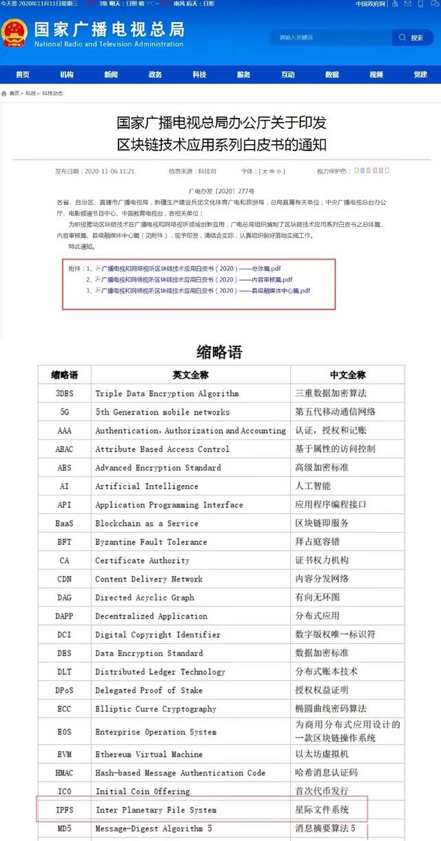 2020年11月6日,国家广电总局在技术应用白皮书—内容审核篇基础层这一章里有专门提到了IPFS分布式存储技术(4.4.2节,第34页)。