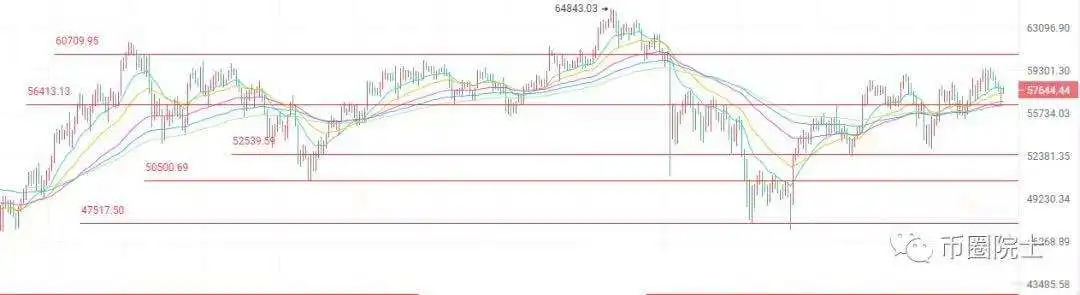 日线回踩EMA30(56270)完美多单建仓点,EMA多头趋势不变,EMA15(56450)依旧在上位,MACD放量减缓,DIF和DEA形成两极分化,KDJ向下拐头,日线布林带拐头有上行趋势,K线上行冲击布林带上轨(60500)失败,回落,4小时K线向下冲破布林带中轨(57490),KDJ向下开口扩散受阻,MACD放量下行,DIF和DEA高位向下扩散,4小时K线跌破EMA移动平均线以后回调至EMA30(57320)之上,综合判断比特币短期内走势偏弱,震荡趋势不可避免,短期内建议做波段为主,逢高做空,逢低做多,行情瞬息万变,勿贪,具体操作以实时策略为主,分析主做参考