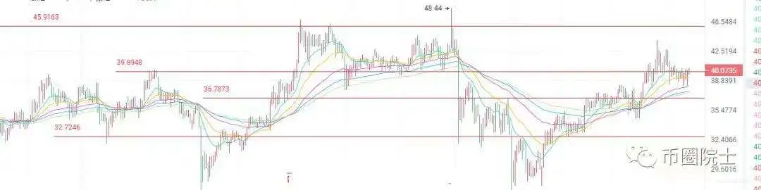 4小时布林带横盘,K线冲破布林带中轨(40.12)后动力不足回调向下,KDJ上行受阻向下拐头,DIF和DEA高位向下扩散,综合判断波卡走势偏弱,短期内不易操作,观望为主,行情瞬息万变,勿贪,具体操作以实时策略为主,分析主做参考