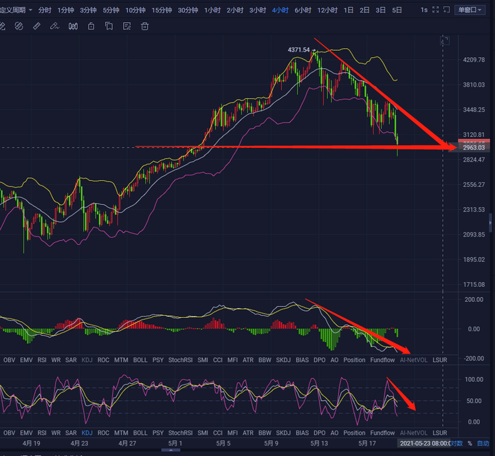 从4小时图上看,目前币价运行于中下轨区间且已破下轨,布林通道开口向下发展,下方支撑位在2960附近,MACD空头放量,双线交叉持续向下运行于0轴下方,KDJ三线交叉向下运行,形成死叉,结合以上分析,整体操作可高空为主,低多为辅。