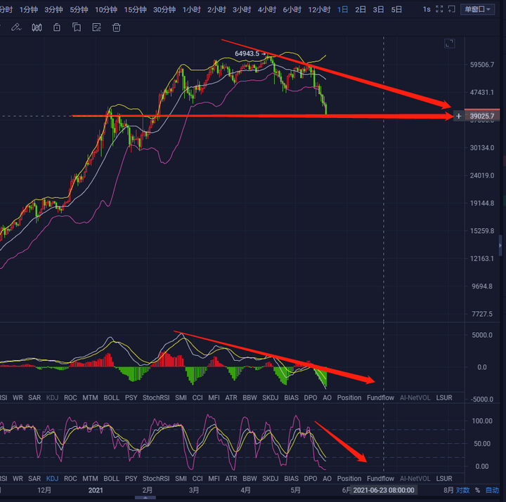 目前阶段大家都能看出空头趋势,从日线图看,底部现在一线看的就是39000底部支撑区间。如果说这一支撑位置持续性打破的话,那么下方将会进一步迎来深跌。MACD空头持续放量,双线交叉持续运行于0轴下方且无拐头之势,KDJ三线交叉持续向下方底部运行,结合以上分析,整体操作以高空为主,低多为辅。