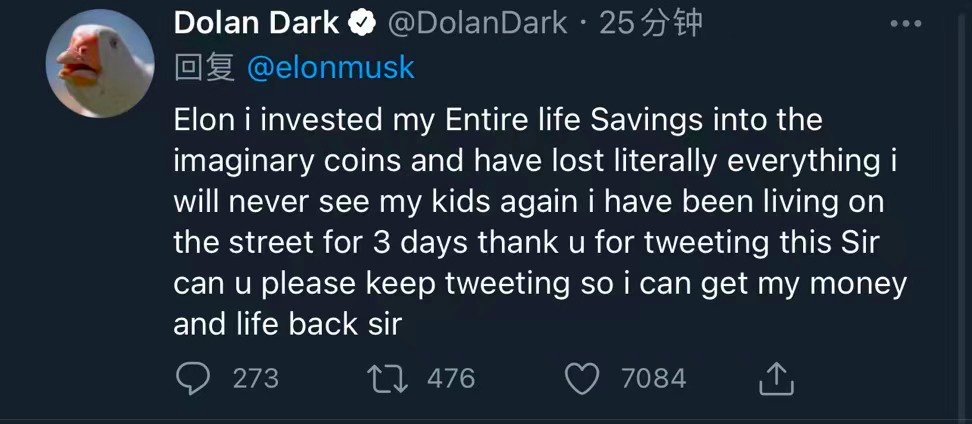 几个小时后,比特币企稳,重新回升至 4 万美金上方。不过,对于那 50 万人来说,他们已经失去了继续战斗的本金。就像投资者们在特斯拉创始人埃隆·马斯克推特下面回复的一样。