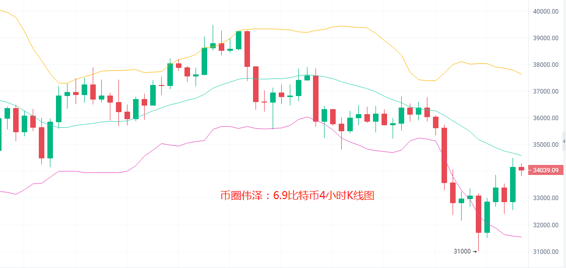比特币现价34039附近,4小时级别中布林带向下开口价格在布林带下轨一线向上想回到中轨,MACD在轴下方运行,各大指标都在弱势区微微向上抬头,小时级别中布林带微微向上开口,各指标都成向上抬头的姿态,金叉开始放量预示短期的反弹先看能否冲上34500 整体来看短期是多头的信号,操作上可以试着回踩接多,