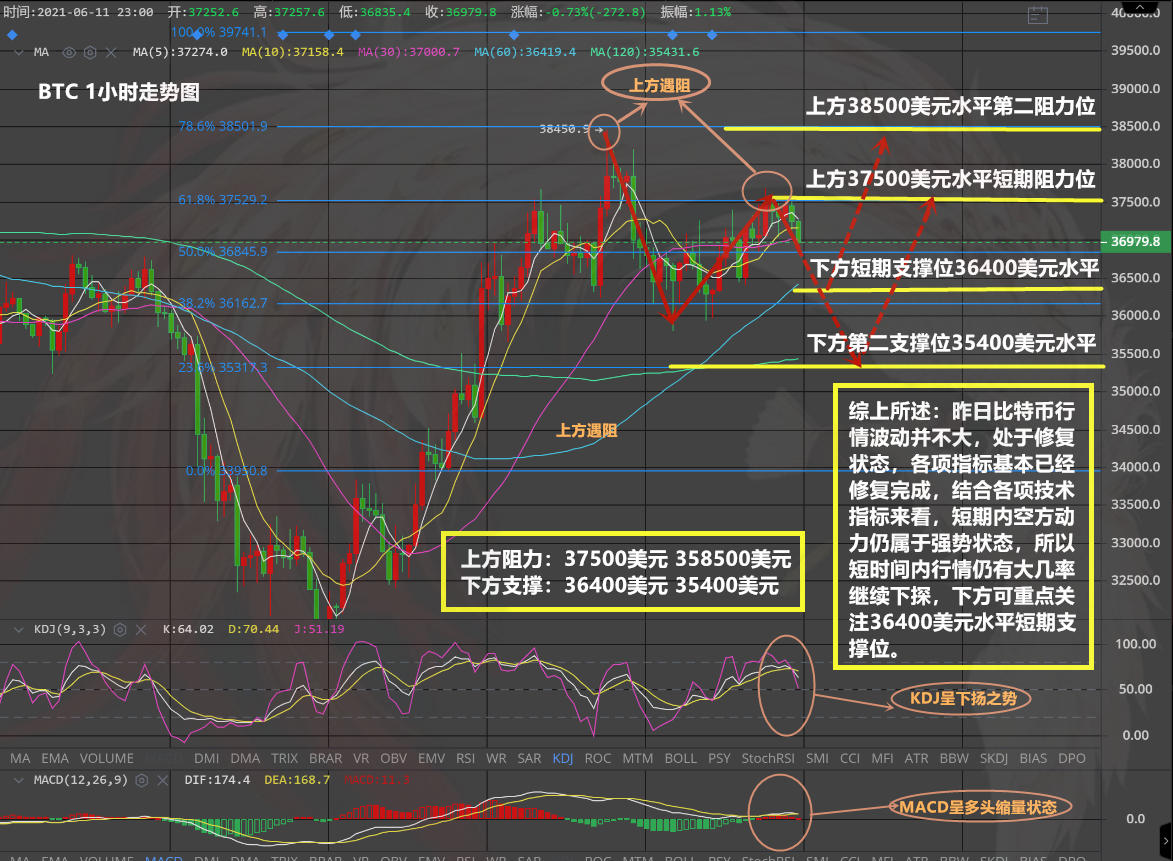 综上所述:昨日比特币行情波动并不大,处于修复状态,各项指标基本已经修复完成,结合各项技术指标来看,短期内空方动力仍属于强势状态,所以短时间内行情仍有大几率继续下探,下方可重点关注36400美元水平短期支撑位。