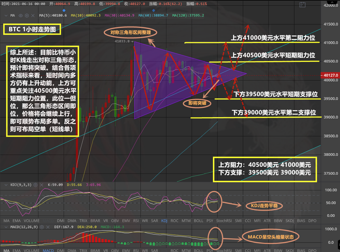 综上所述:目前比特币小时K线走出对称三角形态,预计即将突破。结合各项技术指标来看,短时间内多方仍有上升动能,上方可重点关注40500美元水平短期阻力位置,此位一但破位,那么三角形态区间即破位,价格将会继续上行,即可顺势布局多单。反之则可布局空单(短线单)