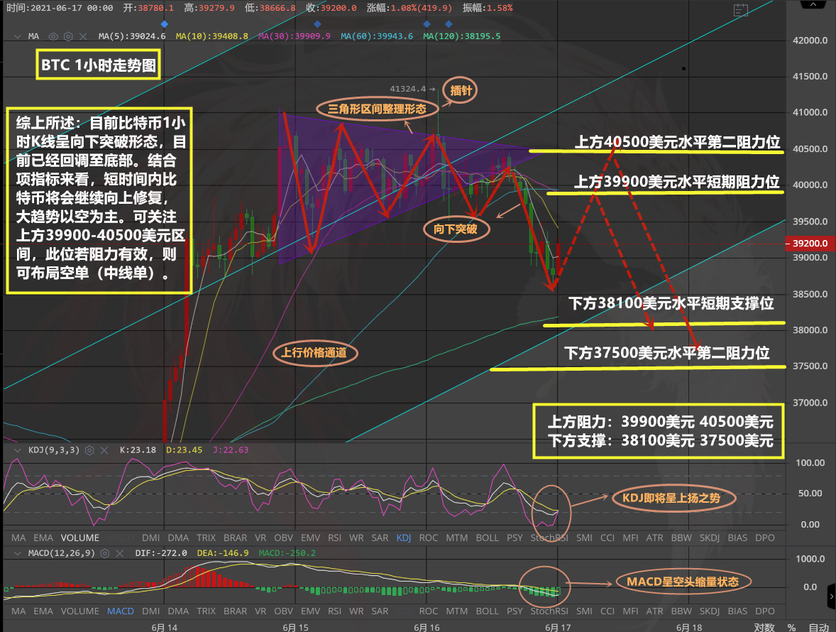 综上所述:目前比特币1小时K线呈向下突破形态,目前已经回调至底部。结合各项指标来看,短时间内比特币将会继续向上修复,大趋势以空为主。可关注上方39900-40500美元区间,此位若阻力有效,则可布局空单(中线单)。
