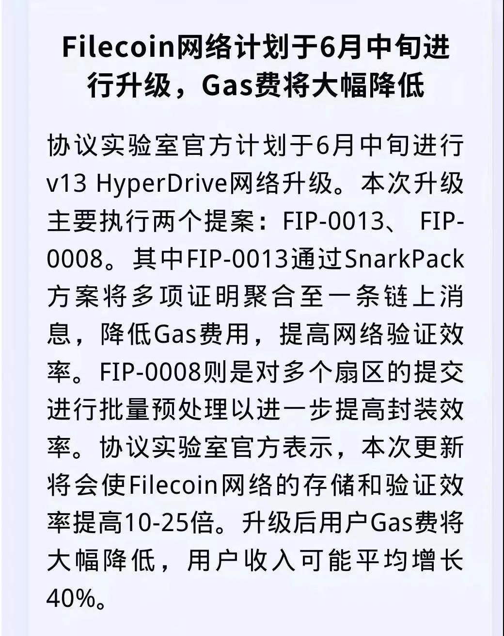 Filecoin发布即将到来的Actorsv5计划,以进一步优化IPFS网络增长和数据存储。此次升级计划将于6月底完成,其中包括四个主要建议:FIP-8,FIP-11,FIP-12,FIP-13和一些其它的漏洞修补方案。在这些建议中,FIP-11和FIP-12之前已先行实施,因此FIP-8和FIP-13将在下一步实施中。预计FIP-8和FIP-13方案将大大降低Gas封装算力的费用,这对于FIL矿工来说将是一个巨大的利好。