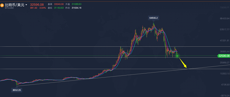 现在回来说说比特币,从比特币第一次跌到三万后,31000这个位置已经是第三次下探了,根据波浪理论来说,本次可能大概率会跌破,然后到两万去。不过由于上次反弹力度较大,也有再一次反弹的可能,但这种概率较小,并且不会突破41000以上,所以个人还是大概率看两万。