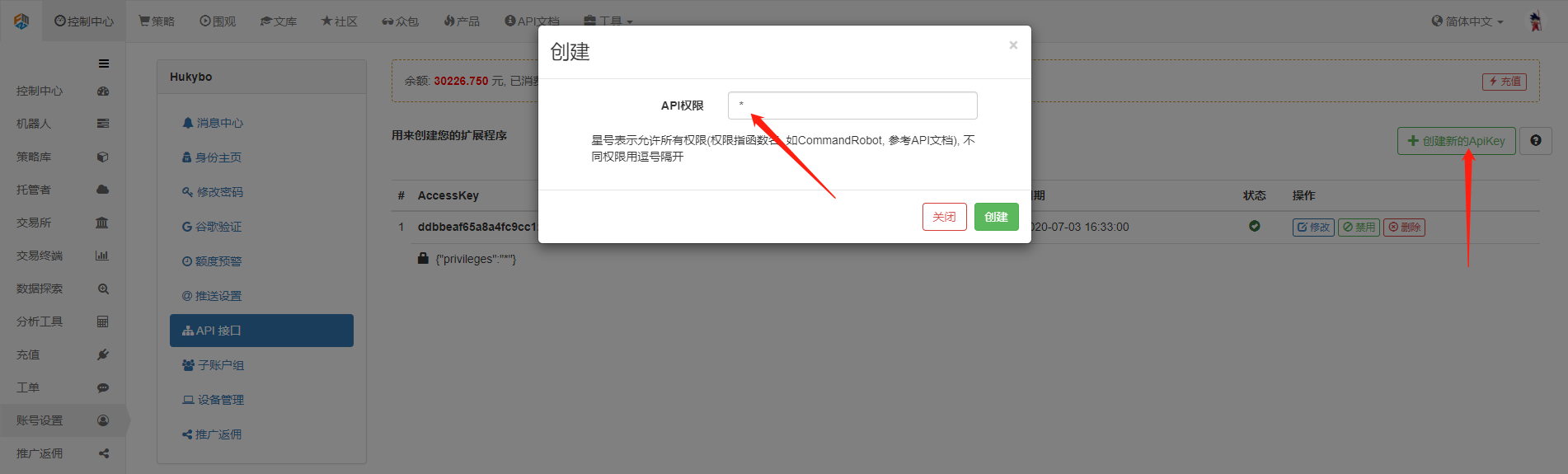 打开该链接 https://www.fmz.com/m/account 选择API接口标签,然后点击右上方创建新的ApiKey,默认“*”号即开启了所有权限。创建完毕后页面就会显示“AccessKey”和“SecretKey”。