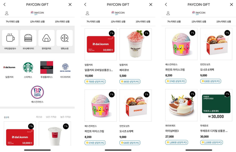“Paycoin Gift”是一种新增的奖励服务,用户可以在应用商使用他们持有的PCI购买电影票、餐饮券、咖啡券等各种产品。此外,对于每笔使用PCI支付的订单还将另外获得一定比例金额的PCI作为奖励。比如图中的7%、12%、15%是指会分别获赠订单金额7%、12%、15%的PCI作为奖励。