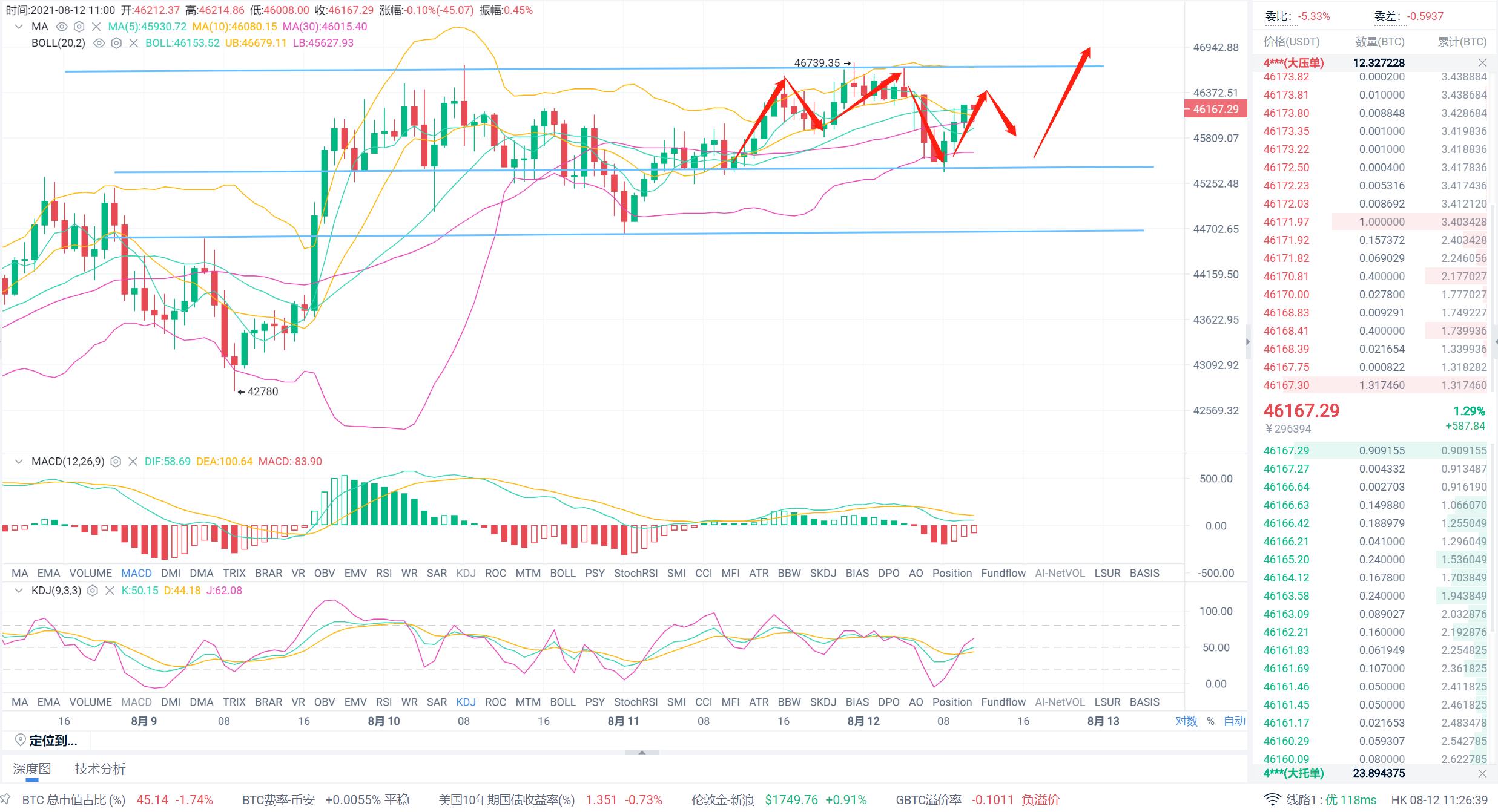 莫愁前路无知己,投资路上有知音,大家好我是玩币天王,很高兴在今天下午这个时间跟各位来复盘一下行情,疫情反复也提醒各位要戴好口罩,避免去人员聚集的地方,下班了回家陪陪家人看看行情操作一下就好了。跌跌撞撞比特币终究还是没有突破我给出的大区间顶部47,000。在凌晨最高来到了46,700上方,随后进行回落,目前行情运行在46,000附近。在加密货币领域,比特币无疑是其中的王者,而中美两个国家在政策面上任何一条跟比特币有关的法案,或者说是政策都将影响全球加密货币的走势。看行情不是算命,而是根据及时的政策以及技术面给出综合的分析,只有这样才能够在币圈长久的生存。