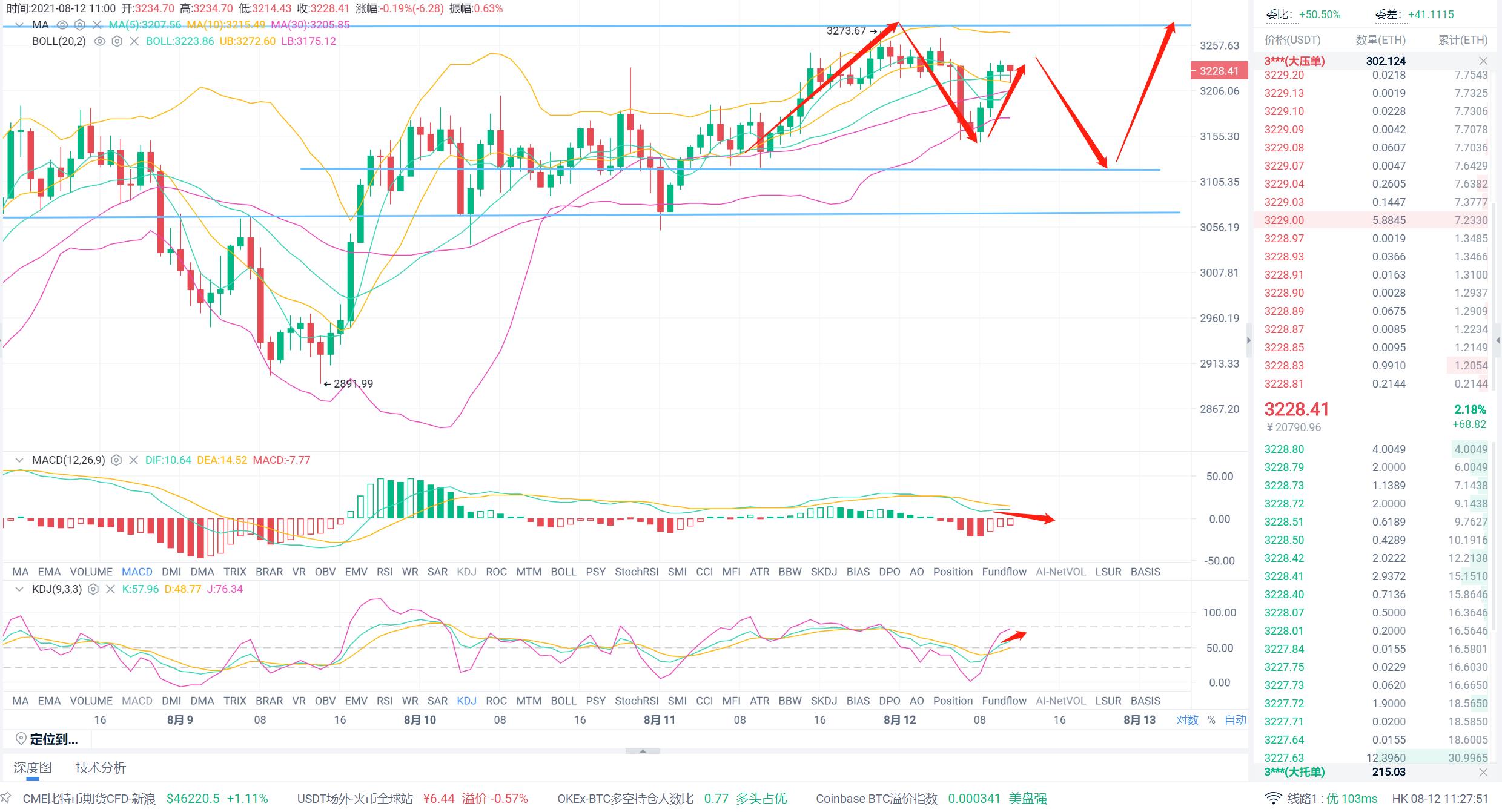 我们再来看一看比特币的大盘,这两天我多次在文章中强调的,47,000点这个位置也是斐波拉契的中分位,目前展现出比较强的阻力,多次试探之后都没有有效突破,出现了一定的承压效果。导致行情基本上都是在45,000到46,800之间运作,其实长期关注盘面的朋友应该都会发现一个现象,就是每个月的月中都会出现一波幅度不算小的回调,应对这种现象,我们就要做好一个准备,将46,000上方列为高风险区域,有多单的朋友建议在这个区域进行分批止盈,而不要再进行高位买盘的。而且从四小指数的走势来看,目前行情形态上呈现出的是一个黄昏之星,MACD也是出现了背离在向下进行空头能量的放量,个人看好短期行情会有一个小调整。下方重点值得关注的位置是45,000,那么今天在策略上,个人是建议46,500到46800附近可以选择进空目标看45,000止损47,000上方。下方的44800,44200,43500这些位置都是值得关注的支撑位,届时如果空仓的朋友可以选择以不同的仓位进场,越高的位置仓位越小,都带好默认止损即可。/玩币天王/