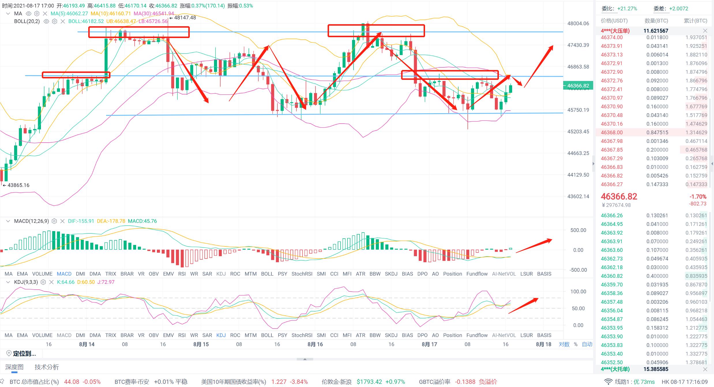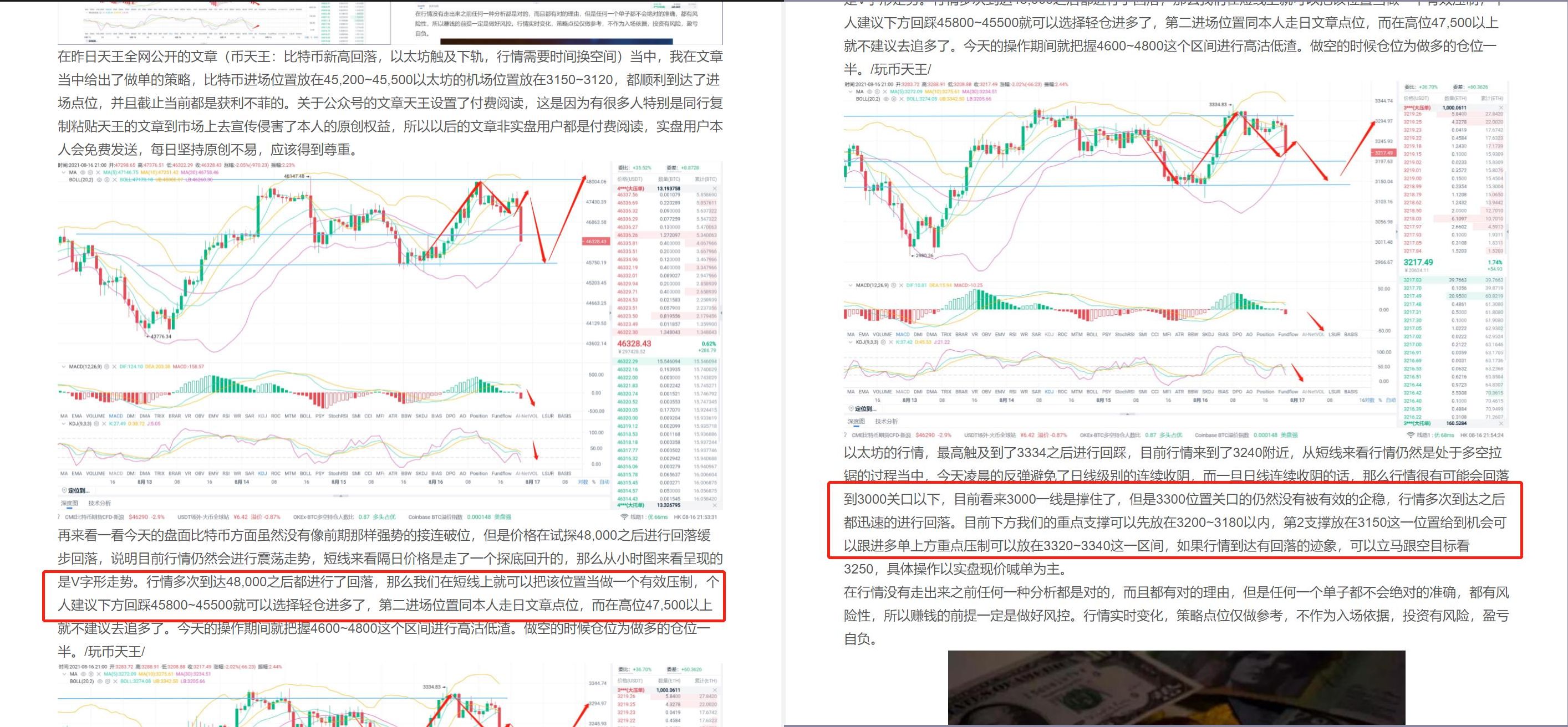 再来盘点一下昨日的文章,昨天全网公开的文章(币天王:比特币48000关口未破,以太坊多空拉锯,慢牛还需要时间)当中,天王给出的比特币在下方45,500附近可以选择进多,晚间最低位置来到了45,250随后就迅速的进行反弹,最高来到了46,600上方,按照天王给出的策略进行执行的朋友,昨晚这一单获利就超过1000个点。以太坊方面,我给出的是激进的在下方的3180进多,稳健的币友可以选择在下方3150附近选择进多,昨晚这两个位置都是给到了进场点位,并且都进行了有效反弹,反弹的位置都超过了3220上方,不管是稳健还是激进的币友,获利都超过了50个点,本人也在微信提示了出局。在面对近期这种修复行情的时候做单子千万不要去追涨杀跌,就把握好区间就行了,天王在文章当中每天给出的区间都是完美可以进场的,有不懂的币友也可以加到天王,跟我1对1的来聊一聊,我来帮你解决你在合约交易中出现的问题,想跟单的也可以跟我一起做。关于公众号的文章天王设置了付费阅读,这是因为有很多人特别是同行复制粘贴天王的文章到市场上去宣传侵害了本人的原创权益,所以以后的文章非实盘用户都是付费阅读,实盘用户本人会免费发送,每日坚持原创不易,应该得到尊重。