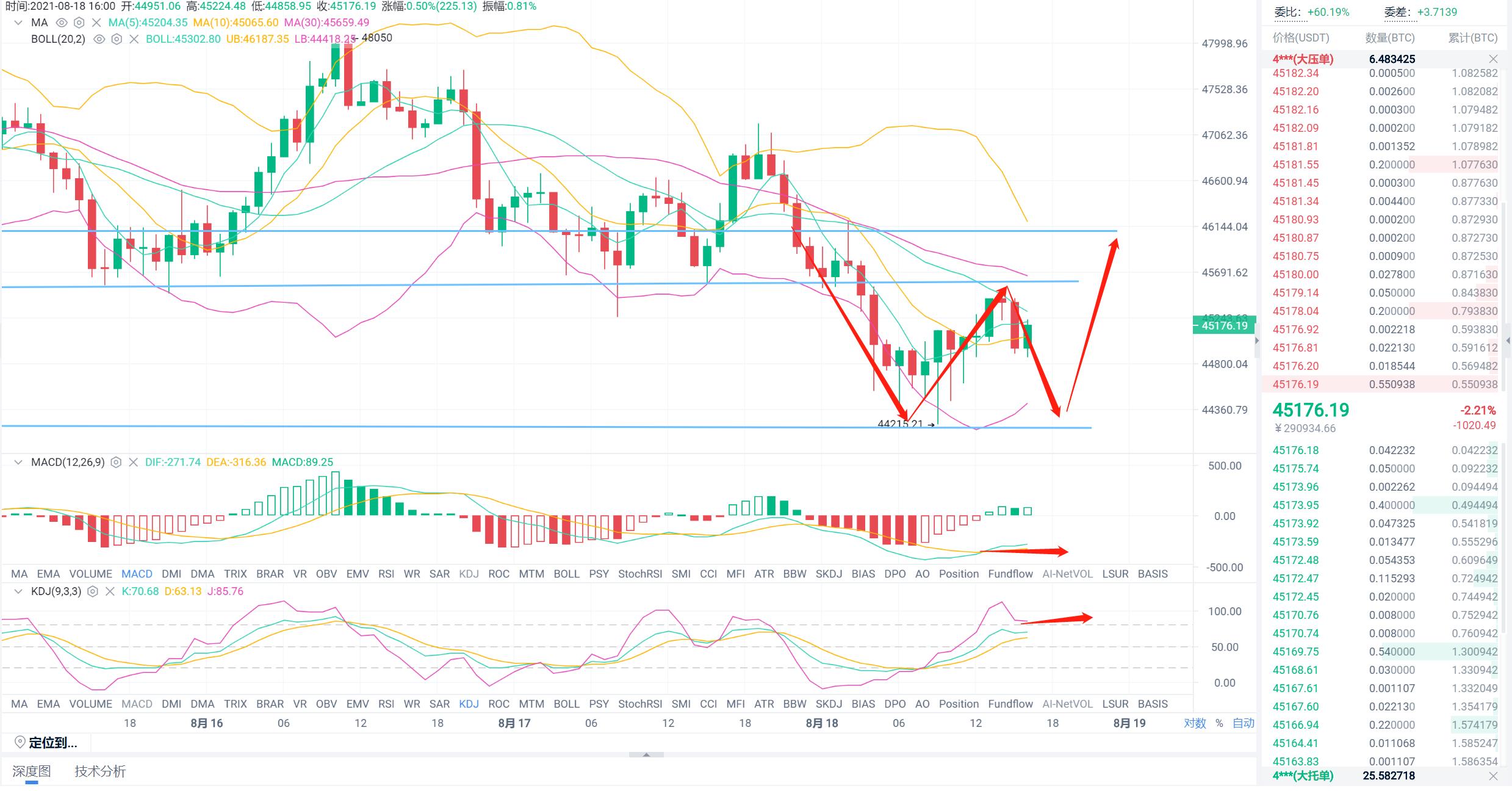 接下来市场上的大方向走势,在我看来值得关注的有一个重点消息面,就是在本月的26号到28号会召开全球央行的年会,在这次会议上美联储会宣布缩减购债的时间表,这将决定美元的流动性,而如果美元的流动性增长正常的话,那么比特币也会一路上行,反之增长放缓,比特币也会遇到压制。还有一个大家可能不知道的细节,就是根据数据分析,散户往往是不会在行情上涨的时候出货的,行情下跌散户才会出货,最近关注的朋友应该知道加密货币市场是处于供不应求的情况,对于机构来讲他们吸不到足够多的筹码,那么行情先进行回落,让想进场的可以进场,就可以理解当前行情了,所以说现在的市场还是比较纷乱的,种种消息都还没有落地,需要时间来消化当前行情。相信长期关注我的朋友一定知道,在方向的选择上天王从未失误过,如果对于合约的交易有任何问题,欢迎随时找到天王我来替你解决问题。