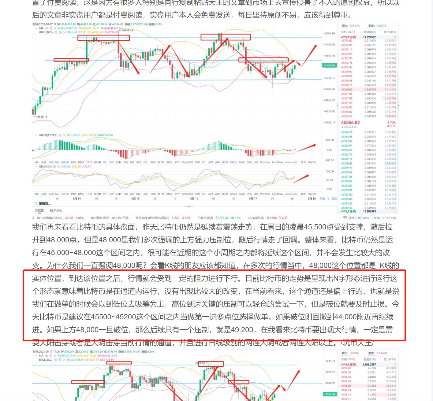 然后再盘点一下昨天天王全网公开的文章(币天王:比特币通道运行,以太坊顶底出现,近期把握区间)当中,对比特币我给出的分析是45,500附近可以选择进多,昨天在晚间的12点行情最低来到了这一线附近给到进场机会,随后反弹了700个点。给出的第二进多位置是44,000附近,在今天的早上9点行情最低达到44,200一线,也相当于给到进场机会,随后行情进行的反弹,最高来的45,500上方,利润也是超过了1000个点。这也算是比较精准的预测的回撤点位,而且在前面47,500上方也提示了大家多单减仓,关键就是在于你相不相信。我一直有一个观点就是你可以不懂技术,但是你不能不相信技术,虽然技术不是万能的,但是在有些时候它就是能够给你一些有效的信号。人永远赚不到认知以外的钱,有些东西最好还是懂一点比较好,如果对于合约有问题的朋友,也欢迎第4天找到我,我这边也有一些专业的技术分析,实盘用户是暂时免费的。关于公众号的文章天王设置了付费阅读,这是因为有很多人特别是同行复制粘贴天王的文章到市场上去宣传侵害了本人的原创权益,所以以后的文章非实盘用户都是付费阅读,实盘用户本人会免费发送,每日坚持原创不易,应该得到尊重。