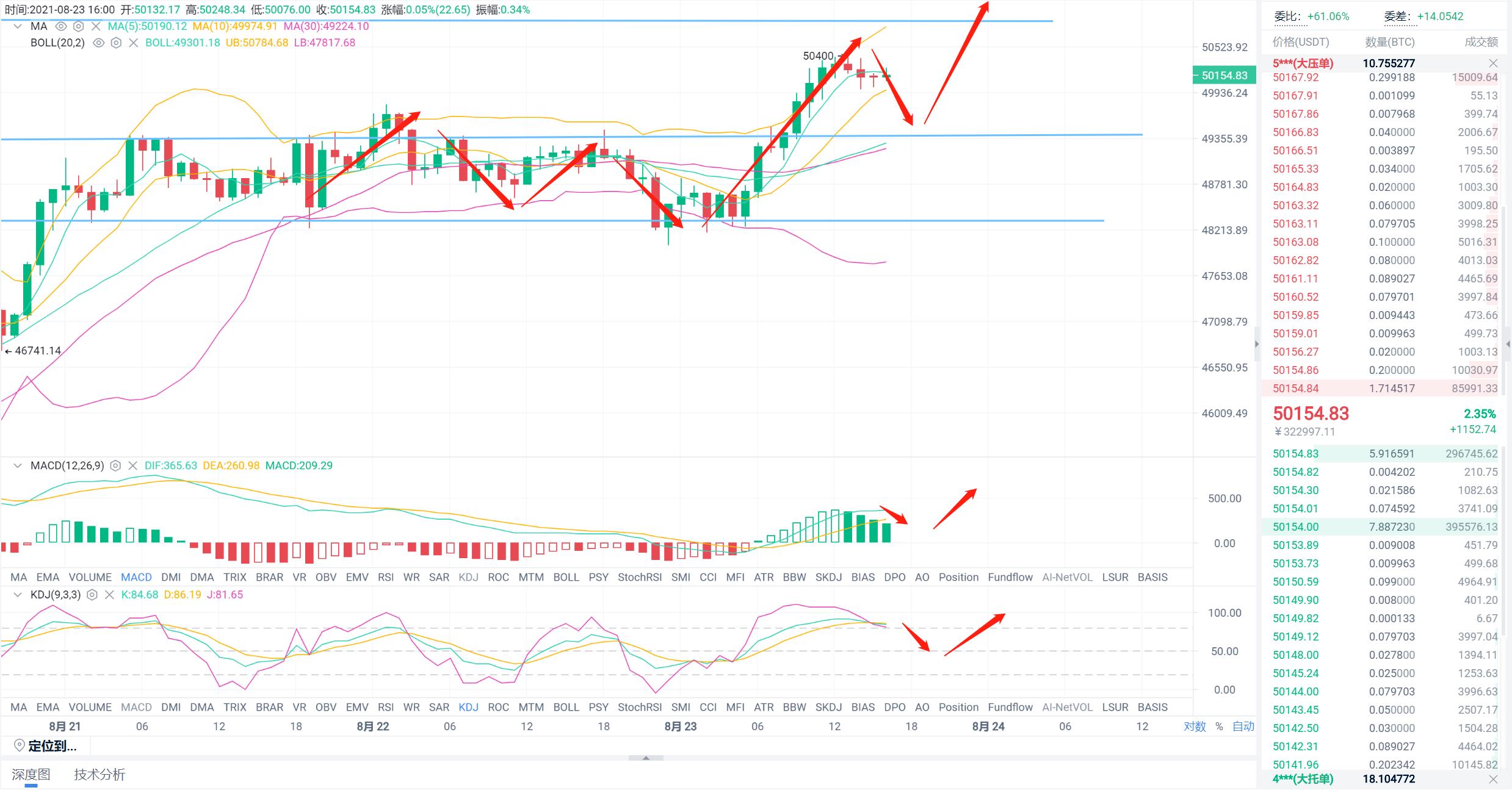 我们再来看看比特币具体的盘面,昨晚比特币在回踩48,000之后,底部支撑被测试有效,随后一路拉升,最高在今天反弹到了50,400上方,从4小时图来看,行情在三连阳之后,小幅收阴,没有出现吞没形态。从日线来看横盘修复之后,比特币打破前期的压力是一根大阳柱强势破位的,那么今天在行情方面可以关注5日均线,就是48,900这个位置,激进的朋友也可以将位置放在前期行情的压制位49,500位置,上方则重点关注50,800。因为从四小图的指标来看,10日均线和30日均线目前都在向上发散走高,5日均线也是出现大的拐头迹象,附图指标方面MACD是多头能量在发散,所以说行情短线肯定是仍然偏多的,会向上测试上方的压制。今天比特币个人是建议在48,800~48600这一位置可以进场多单,目标看50,500一线。/玩币天王/
