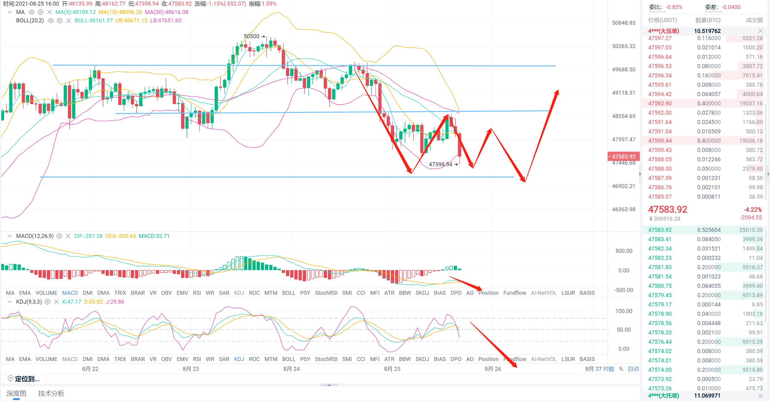 另外还有一点值得关注的就是在本周五是比特币期权未平仓合约到期啊,根据机构估计本次平仓的合约集中位置是在5万美元这一关口,这一天也刚好27号,恰逢央行年会叠加,所以一定要在27号做好准备,谨防黑天鹅出现,如果在本周五之前,行情出现日线级别的大回调,并且打破日线级别的上行通道线的话,那么行情将有继续向下试探46,000一线的可能,反之则有可能出现里程碑事件破10,000亿美元关口。而在当前行情之下,可能有一些币友套有49,000上方的多单,那么面对这种行情我们该如何去解决呢?首先当前点位在47700附近,短周期来看,指标已经出现了一定的背离,在昨日下方47,600位置受到支撑,说明这一线的通道底部,自身仍然是有效的,如果今天再次试探一波之后没有打破这一位置,那么行情就有极大的概率重新回到49,000上方,当前行情有两种办法可以解决,一种就是在48,500附近给一个锁仓,然后给出回落超过800个点就将锁仓的部分平仓,然后将多单的止损带在47000下方。