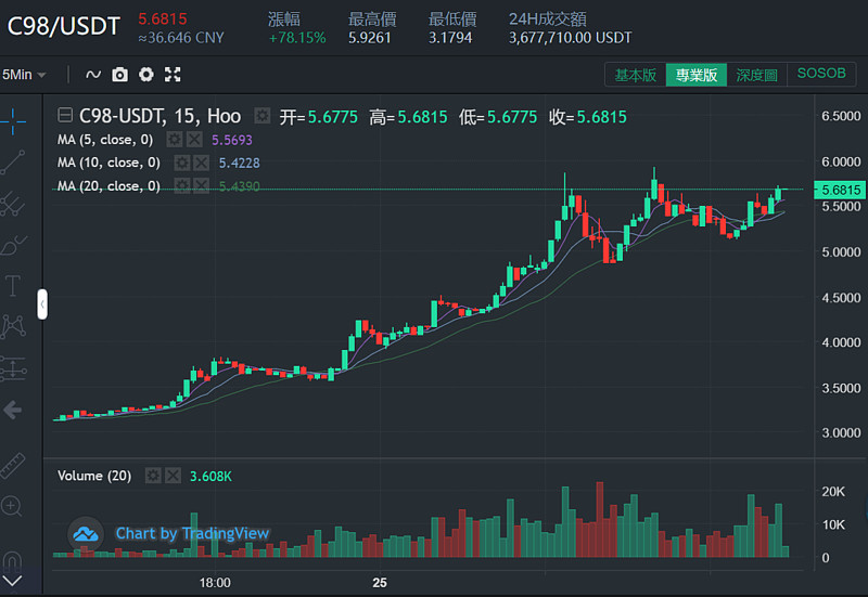 (数据来源:Hoo虎符交易所-C98当前涨幅高达78.15%)