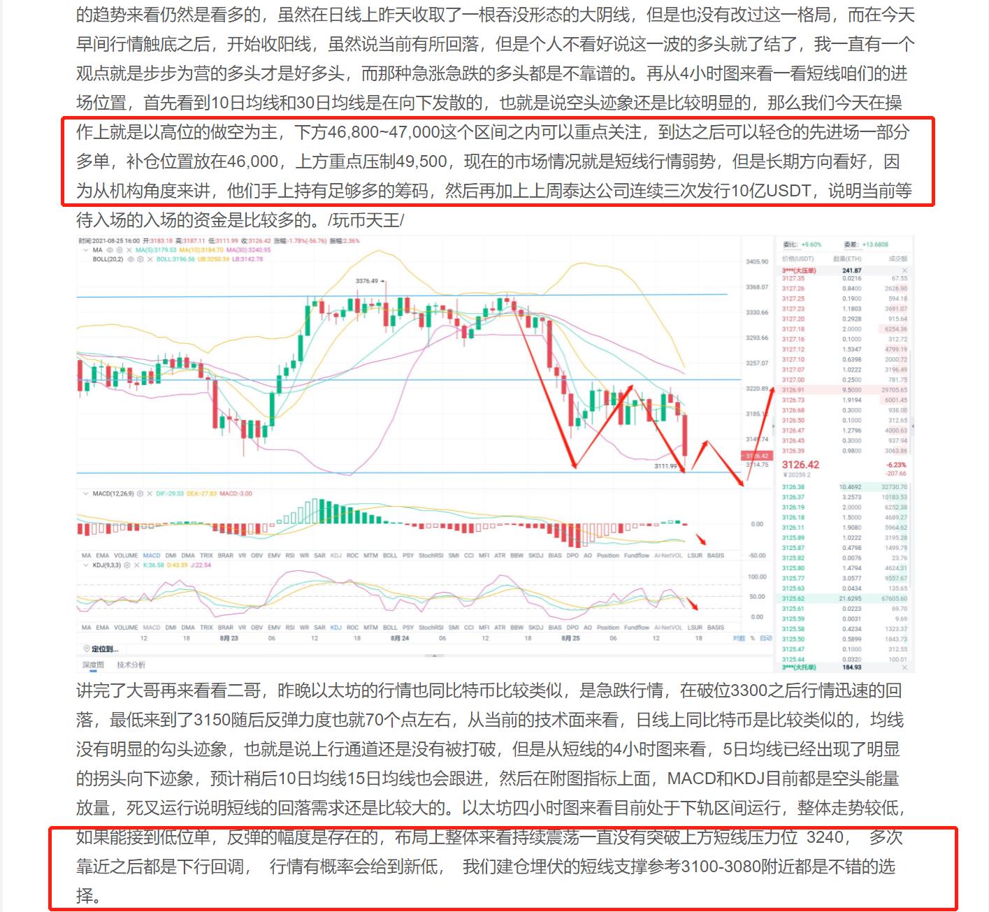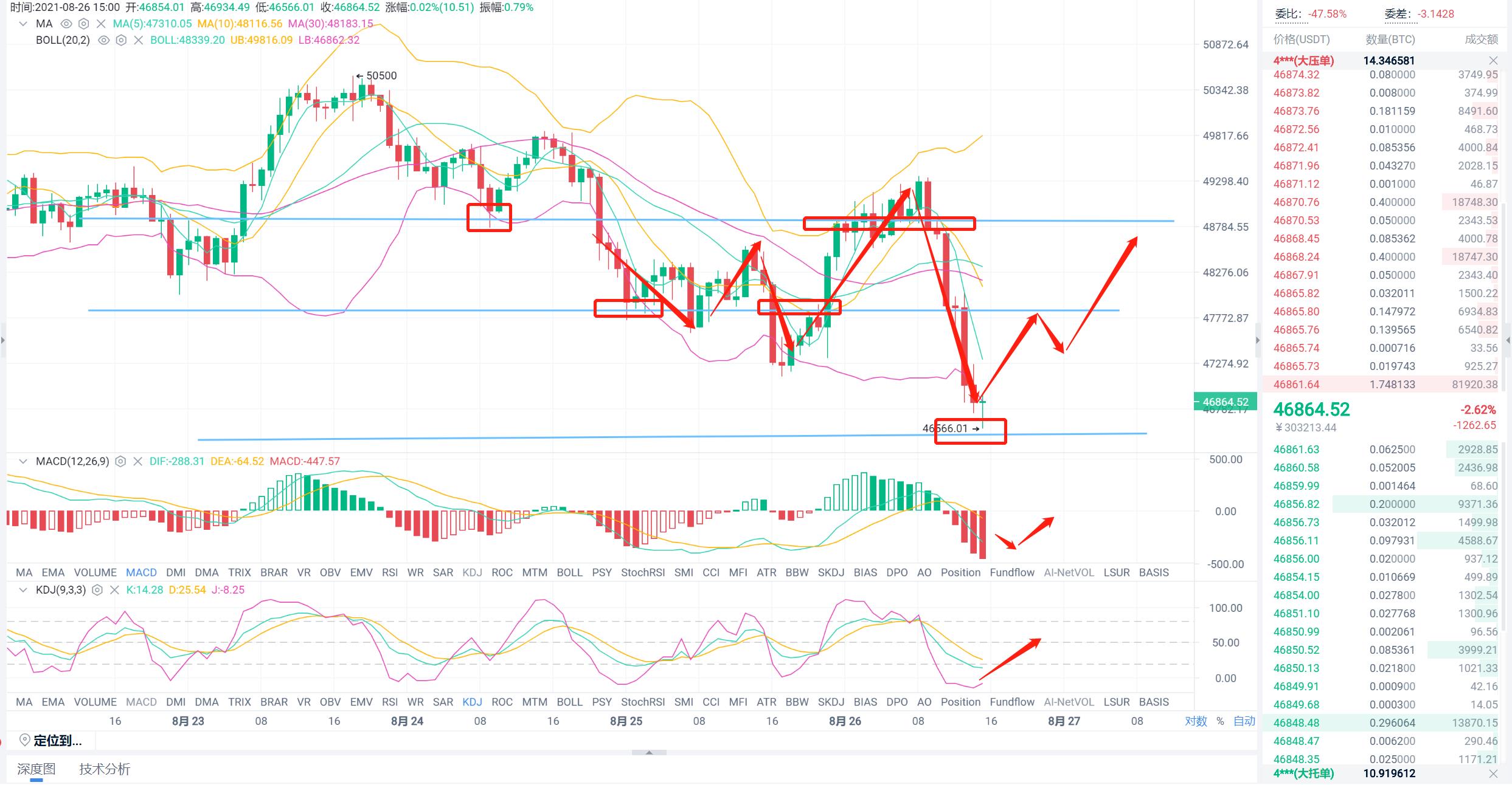 再回到对比特币具体以盘面的分析来看,在短线上来看,比特币已经击穿了前期的支撑47,000点,目前行情达到了46,600附近,行情目前处于多空分歧比较严重,然后市场换手率比较高的阶段,目前关注两点第1个是MACD在低位什么时候形成金叉,第2点是30均线,什么时候能够汇聚10日均线。目前从小时图和4小时图来看行情已经站在了布林下轨下方了,一般情况来讲,比特币的行情很少长时间的贯穿布林下轨,目前建议重点关注下方46,500到46200一线的支撑,如果下一小时图比特币收线能够回到布林带通道当中来,那么今天的行情还是有希望的。上方的支撑则可以重点关注这一波行情的起跌位置,也就是48,800一线。当前行情天王是建议做现货,还没有进场的币友,可以先暂时观望,不用在高位去接盘当下的价格不是最合适的屯币位。不管是那些鼓吹比特币将要突破10万美元,还是将比特币要跌破3万美元的人,他们的意见我们大可以忽略,毕竟空口白话谁都会讲。对于主要操作合约的朋友,个人是建议重点关注我们51000这个位置,该位置只要不被涨破,那么行情必然会有5000个点左右的调整。从之前公布的行业消息来讲,比特币的价格在49,000上方的时候,大多数的机构是有不错的利润的,有一些完成的出货,然后留有一部分的持仓等待回落之后再度的攀升,那么个人也是看好行情,会给到一波回落让之前出货的机构再度进场。在本周合约的交易上,个人是建议以做空为主,然后近期做单切记要带好止损,很多人喜欢扛单,这一点天王是非常不能理解的,在我看来带止损就跟开车系安全带一样,这不应该是最基本的事情吗?/玩币天王/