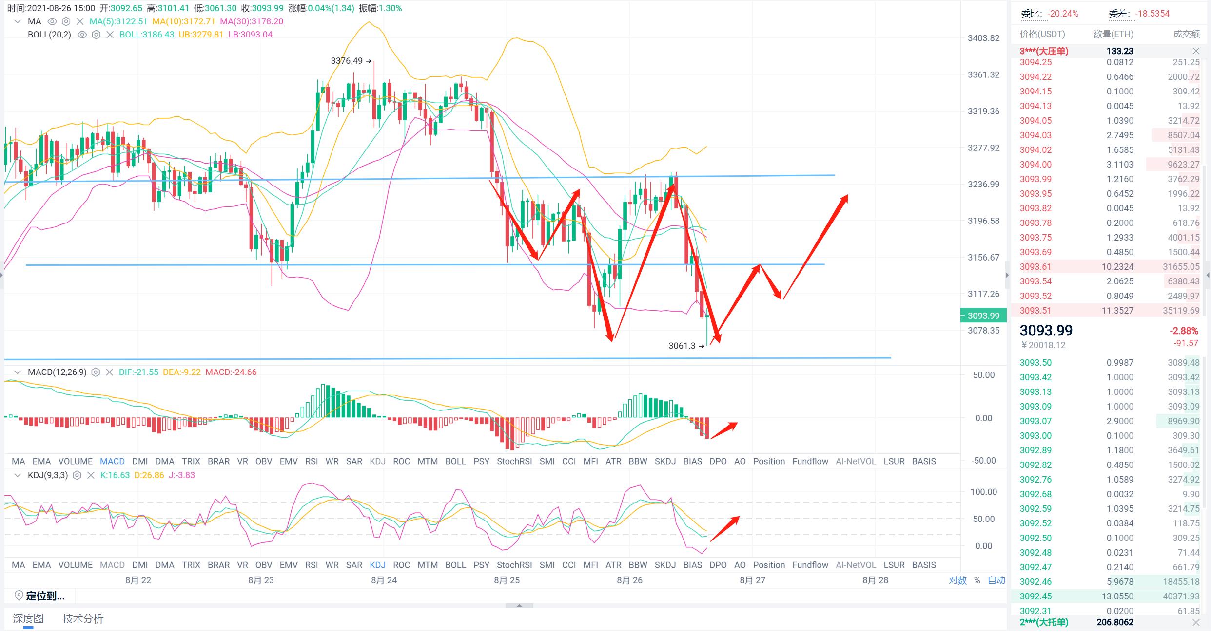 讲完了大哥再来看看老二,以太坊的行情同比特币是高度相关的,近期也没有影响走出独立行情,当前以太坊的价格运行在3070附近,短线来看仍然是空头占优的,目前也同比特币一样跌破了小时图和4小时图的布林下轨,个人是不看好以太坊的行情长期的站在布林下轨下方的,那么当前值得重点的关注位置就是3050~3030,这一些可能是目前短线上最强的支撑位的,空仓的朋友可以尝试去操作一下。如果说是操作特别稳健的朋友,那么下方的2950~2980这一位置可以进场,但是个人是看好比较难到的,上方3240~3260仍然是强压制,到了也可以把握空单。