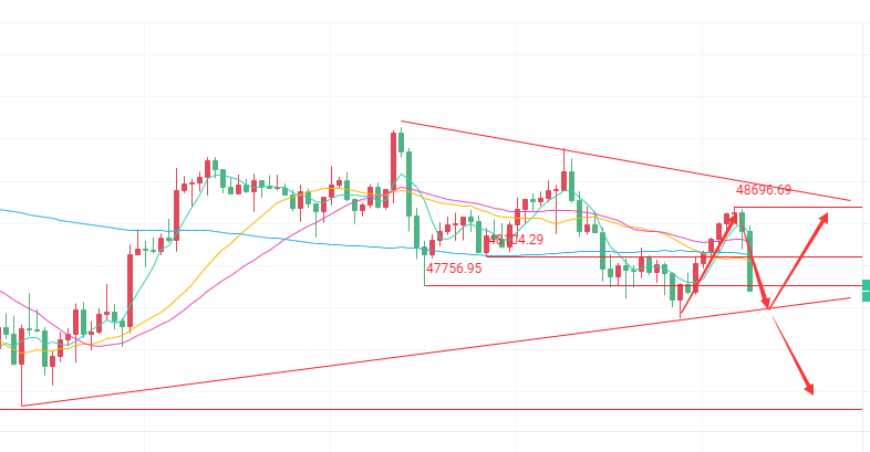 比特币(BTC),相较于以太坊的强势拉伸,比特币走势倒是符合我们的研判,晚间在47369的位置止跌后,短线给到一波技术性反弹,并且再次企稳48000大关,可是反弹来到48700附近后,行情果不其然再度承压下探,完全符合我们凌晨48500附近布局空单的思路。可见,即便是相互关联的产品,细节也不完全一致,比特币更为稳健。当前,小时线在48700的位置遇阻,那么形态上表明49200的强阻是有效的,而行情的再度转跌,也意味着上方50500的突破难以实现,短线大涨的可能性不大。操作上,早盘依旧以48500为压制布空,下方支撑关注47500,破位看47000关口。