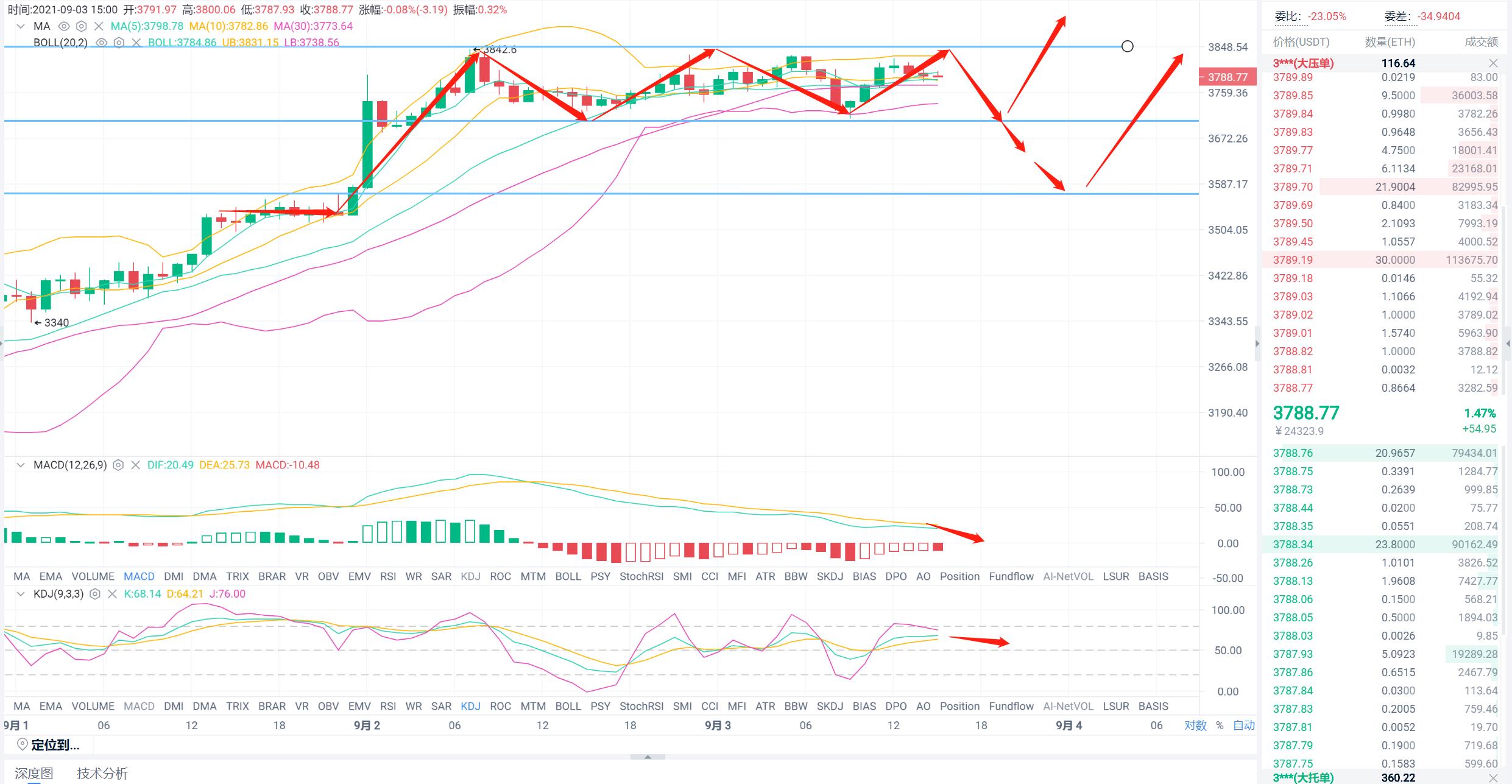 以太坊也是在早间行情从高点进行回落,最低来到了3700附近,随后进行反弹,目前行情在3800附近。从小时图来看行情在4连阳之后小幅收阴,说明行情整体来看还是比较强势的,在操作上是建议以回踩做多为主。从日线来看,MACD处于金叉运行,但是当前价格你均线支撑有点太远了,而且很有可能在近期迎来一波回调修复。如果说没有上车的币友,这可能是一次机会,可以重点的去关注把握。对以太也是给出两个区间,小区间3700到3850,大区间4050到3550,在这两个区间范围之内,都是可以高估低渣的。如果出现极端行情破位,那么是可以顺势追单的,做好风控就可以了,这一思路在这个周末都是可以执行。