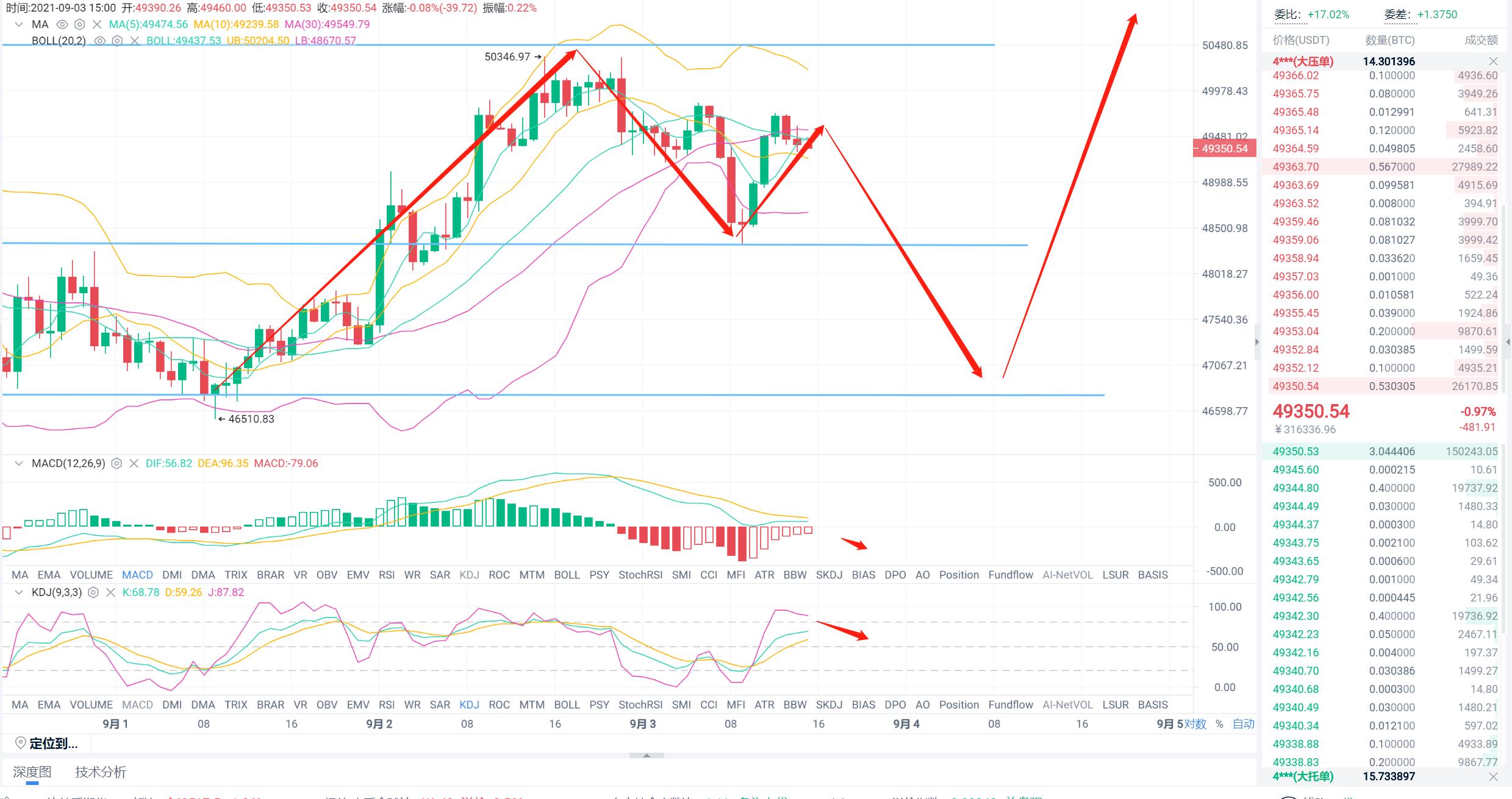 这两天比特币的行情可以说是跟天王的上一篇文章,所讲的一样,开启了补涨行情,但是上方的压制为51,000,仍然是没有被有效穿破。投资圈有一句老话,金九银十,而在去年比特币的行情也是从这个时间段开始启航。在接下来的行情当中,就看比特币能否破位,万一能够破位后市可期,不能破位行情仍将震荡,在接下来的投资中,我们应该将仓位合理的分配,第1部分是以以太坊为主夹带着dot,uni,sushi等新主流币,它们的波动性普遍同以太坊成正相关。第2部分则是以比特币为主,连带着有BCH,LTC等。近期值得关注的板块也是天王上一期所讲过的,NFT, DEFI,元宇宙还有波卡,当前把握市场波动的九字经就是比特稳,以太热,龙头强。