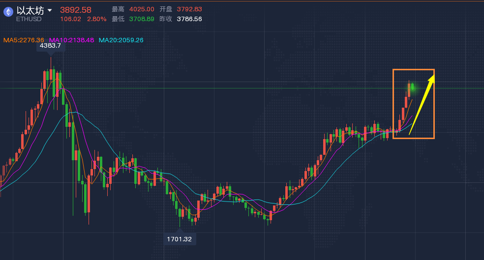 以太坊回撤3845就放心大胆的多,很多交易者看到回撤很凶猛,不敢进,甚至去追空,一追就被套。所以,方向要看准,看准了就干,不要犹豫,且从日线看,每日上涨波幅也很大,现在完全没有滞涨的现象,为什么就不敢多了?