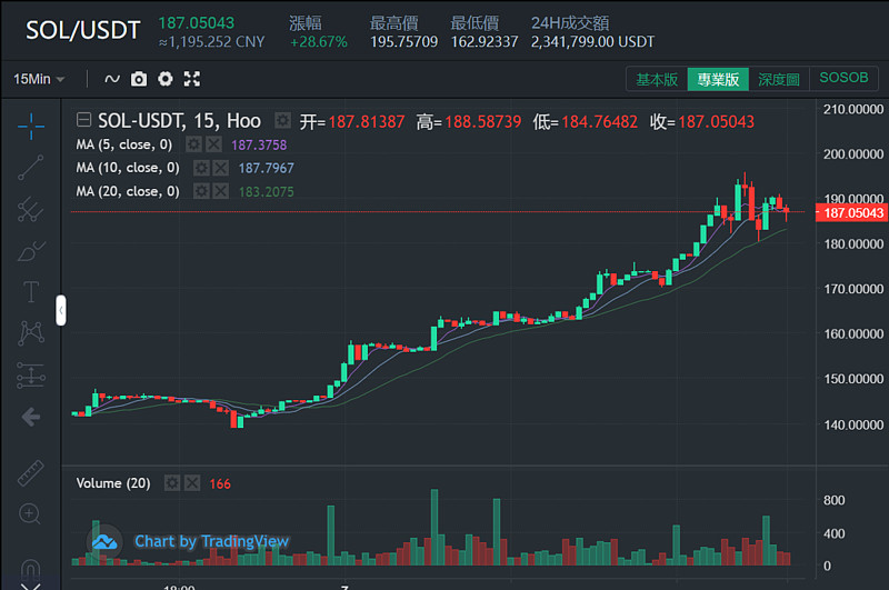 随着今日BTC一举突破50000$大关,多个优质公链币系上演了一番强势上涨。据Hoo虎符交易所SOL/USDT交易对数据显示,今日SOL强势上涨28.67%,最高价达196.75$。