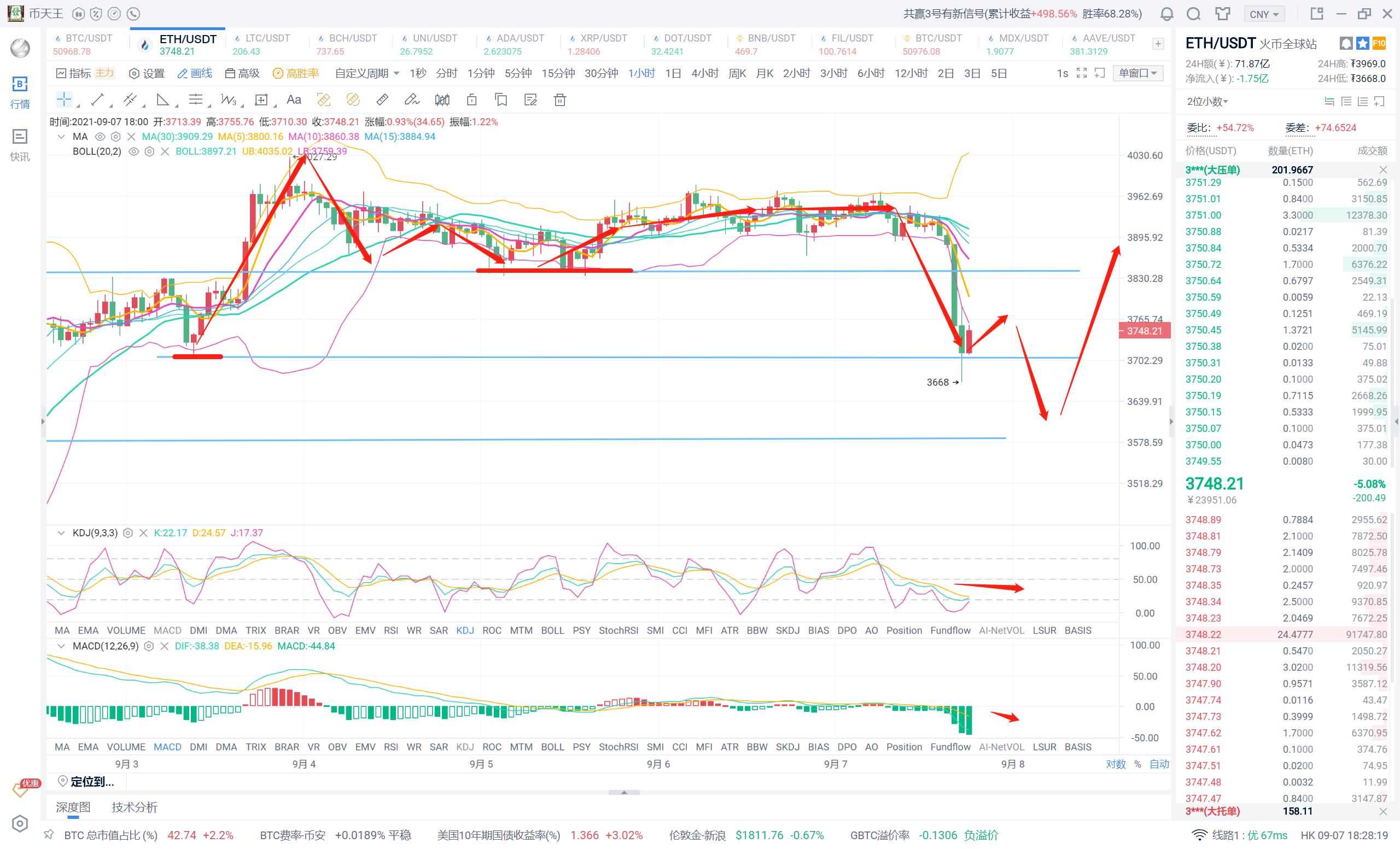 对于比特币的行情,昨天天王全网公开的文章(币天王:BTC慢牛发力,ETH震荡修复,步步为营才是好牛市)当中也说明了,个人是看好在52,500附近进场空单的,行情也顺利的给到了进场位置,截止当前利润也超过了1000个点,以太坊给出的分析是上方重点关注4030,但是没有给到进场机会,但是下方的支撑位3720刚刚给到了机会,最高反弹3290,利润也是超过50个点。在今天萨尔瓦多也是宣布推进比特币的法币化,并且购买了数量不少的比特币,这也为比特币在本币汇率不稳定的南美国家提供了带头作用。在天王看来,当前比特币这波上涨浪潮主要有四大原因:分别是各国央行的量化宽松政策,然后就是对于汇率不稳定的落后国家,传统的法币交易成本非常高,然后就是现金极度不保值;再就是以usdt为首的稳定币在加密货币和法币中间起到了非常好的桥梁沟通作用。第4点就是加密资产挖矿的能耗下降,并且区块链技术在全球的发展以及应用得到了长足的进步。