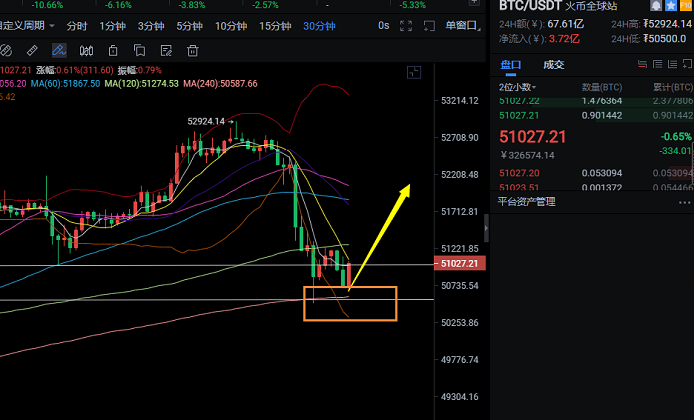 晚间个人还是偏向反弹向上,以50500为支撑做多,若凌晨前跌破这个位置,那么就要另行考虑方案了,只要50500不破,个人午夜大概率看涨,若在51500一线已进场多单还持有的,建议也可进行补仓,注意带好止损;