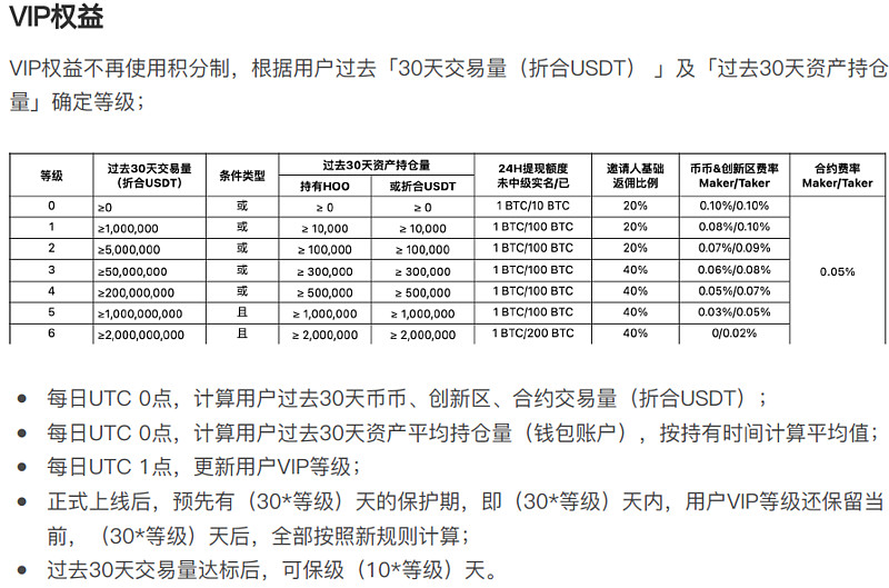 从公开信息可以看到,虎符此次VIP升级取消了之前通过交易量转化为积分,再划分VIP等级的繁杂模式,升级后直接通过月均交易量计算对应的VIP等级权益。并且VIP权益也不再与交易量强关联,用户只需要在虎符持有超过10000美元以上资产或者持有超过10000枚HOO,即可享受VIP1级优惠,其中Maker费率为0.08%,Taker费率为0.1%。