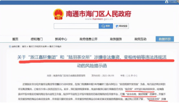 2021年5月20日,海门农商银行报道了“陆羽茶交所”,提醒可能是非法集资诈骗。2021年6月2日,湖州公安在其官方微信公众号中发表了一篇“这周你被骗了吗?这张图很重要”,其中点名了“陆羽茶交所”。2021年6月4日,南通市海门区人民政/府网站发布了“关于“浙江嘉轩集团”和“陆羽茶交所”涉嫌非法集资、变相传销等违法违规活动的风险提示函”。2021年7月28日,人民网相关官方账号再次发布了“陆羽茶交所”交高额入门费、发展会员返利,涉嫌传销、非法集资被多地方通报的相关报道。