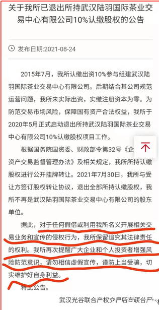 武汉光谷产权交易所是一直被陆羽茶拿来宣传,引以为傲的所谓的国资背景。但也已经发布公告退了陆羽茶公司的股权。