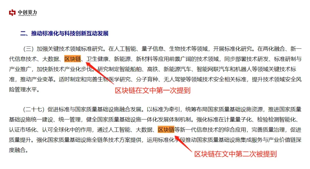 在推动标准化与科技创新互动发展和推动标准化改革创新两大目标里,区块链作为新一代信息技术被提到两次。