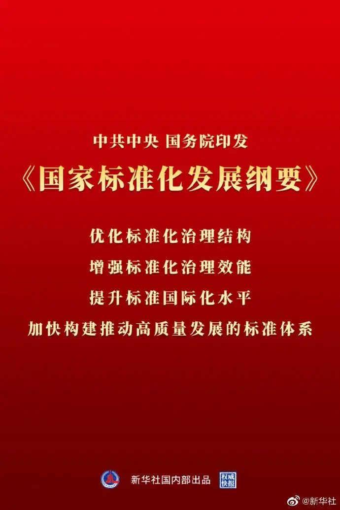 10月10日消息,中共中央、国务院印发《国家标准化发展纲要》,为未来15年我国标准化发展设定了目标和蓝图。