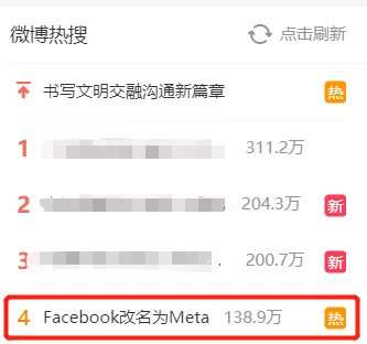 中创热点:All in Metaverse(元宇宙),扎克伯格在豪赌一个未来! 仅一个小时的时间,有关“Facebook正式改名Meta”的消息就冲到了微博热搜前五,引发了近3亿人讨论关注。 一个成立17年的科技巨头公司为何突然改名?这背后和元宇宙又有什么关系?