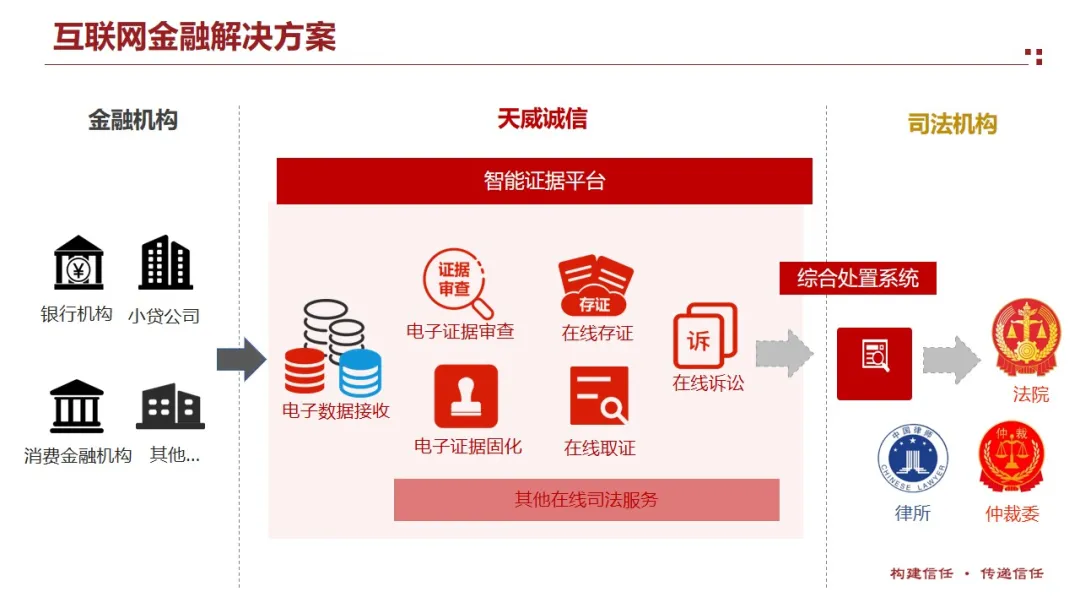 天威诚信围绕互联网金融行业电子证据难以固化、违约纠纷处置难、运营成本高等问题,提供包括电子签约、电子证据、多元化纠纷处置等在内的全流程服务解决方案,为互联网金融行业提供有力、可靠的司法保障。