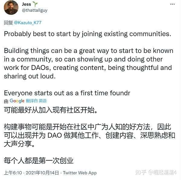 您可能无法立即开始为项目做出贡献。首先在专用的 Discord 频道中与您的同行进行有意义的对话。开诚布公地开展这些活动,为治理、成员资格、角色和程序等流程增加价值。成为 DAO 贡献者的关键是声明您的可用性,并对您可以执行并增加价值的项目或任务负责。这个过程与在企业界工作大不相同。在 DAO 中,没有人会放弃一份工作,你必须积极主动地寻找有意义的工作。一旦你找到它,你就不需要征求别人的同意,也不需要花几个小时来证明你的行为是合理的。你只需要在会议上提出你的想法,写一篇小论坛帖子,在小组中达成共识,你就可以开始了。志愿服务,把事情做好是必经之路!不要犹豫,去参与吧。