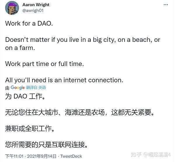 将来,普通人可能不会为传统公司或公司工作。现在正在创造工作的未来,通过新的协调、生产和补偿方式出现,由围绕区块链和加密协议形成的网络实现。这种转变已经开始为全球个人开启新的创收方式,并且由于其快速增长,正在为从传统组织到 DAO 的价值转移创造条件。