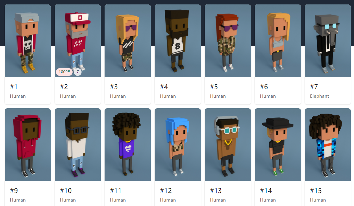 Meebits 更像是 CryptoPunks 的升级版。CryptoPunks 是像素化的 2D 图标,而Meebits 是用体素渲染的 3D 角色,从大头贴升级成动态体素的人偶,由多种常用的不同元素 NFT 收藏品组成。包括: