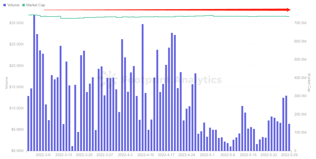 此次收购将 Meebits 在二级市场的平均价格从 3.5 ETH 提高到 7 ETH,而 Meebits 系列在 3 月至 4 月期间的交易量有所增加。 此后,由于 5 月份加密市场的动荡,日交易量有所下降,但 Meebits 的市值仍保持约 7.3 亿美元,同比增长 1,239.9%。