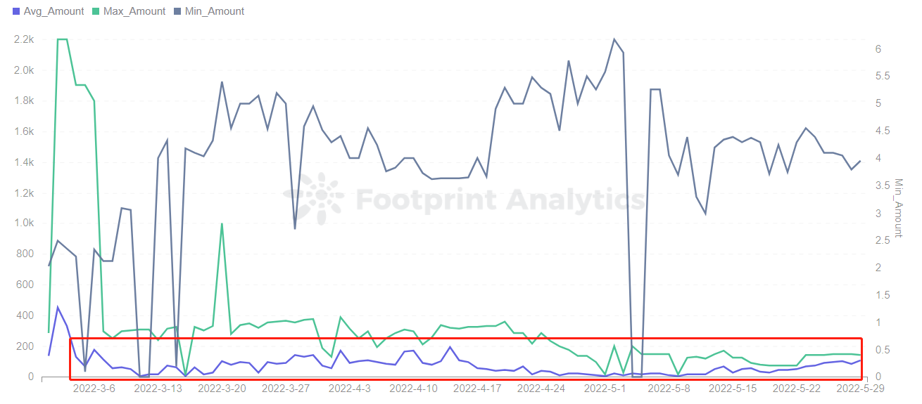 Footprint Analytics 显示,在 2022 年上半年,即使 NFT 的加密市场具有波动性,Meebits NFT 平均价格仍保持比较平稳的趋势。