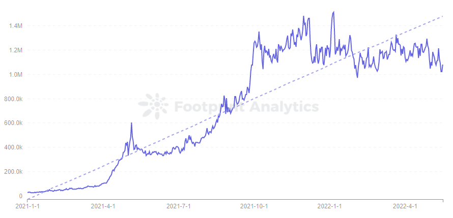 根据 Footprint Analytics 上的数据可以看到,GameFi 的用户数在去年 12 月达到顶峰,进入 2022 年后略有波动下降,显现出增长乏力的状态。总体用户数基本维持在 1.2M 上下。