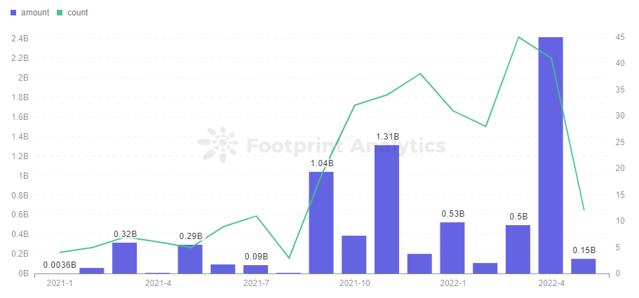 虽然今年开始 GameFi 整体情况不尽如人意,但这并没有妨碍 VC 的投资进程。根据 Footprint Analytics 在游戏领域的投资数据看到,与去年同期相比不论投资金额还是数量都有明显的上升,尤其在 4 月获得了 41 笔合计 24.1 亿的投资。这其中不乏一些 VC 开始布局 3A 的 GameFi 游戏。