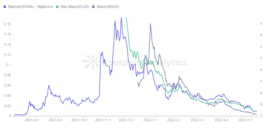 从 Footprint Analytics 的数据上看到,在目前收集到的 3A 游戏发行的 token 中,除了 Illuvium 的价格较高,其他游戏如 StarLink、Star Atlas 和 Sidus 的 token 价格都已低于 0.01 美元。并且它们价格趋势都十分相似,在去年末今年初概念火热时价格达到高点后就一路下滑。
