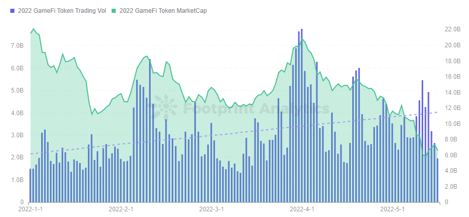 GameFi 的市值和交易量一般呈正相关关系,但 5 月初整个市场下跌时两者却呈负相关。交易量明显激增,用户纷纷从这种不稳定的游戏经济模式中出逃。