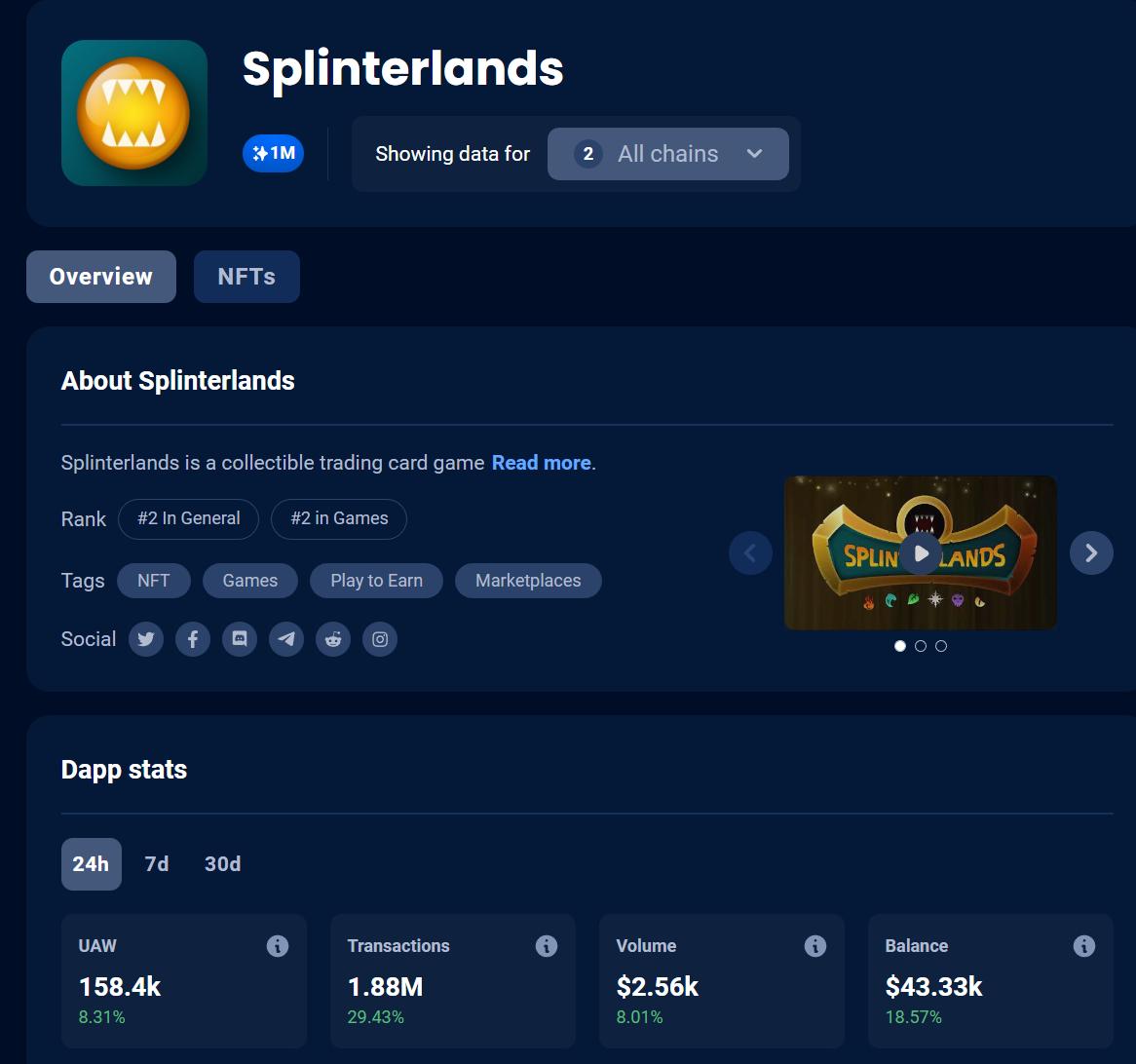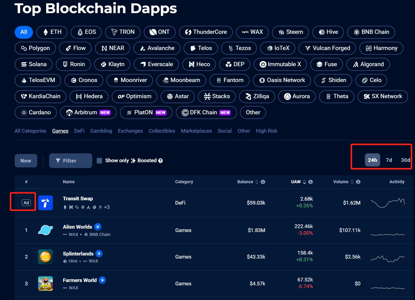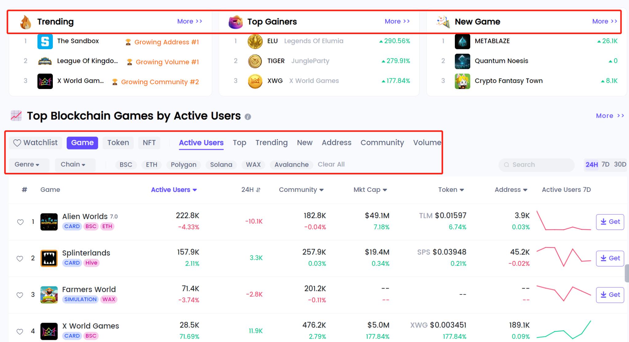 DappRadar 在其 GameFi 板块上监控 35+ 条区块链。该平台的主要功能是能查看当前热门或新开发的 dApp 网站地址、交易量、每日活数据。目前覆盖了 2000 多个 GameFi 应用,玩家可以通过这些数据判断是否入局。