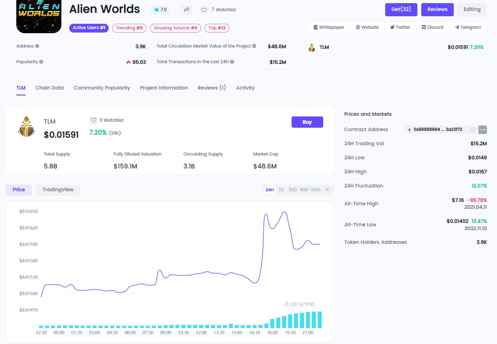 对于每款游戏,DeGame 都显示广泛的信息,包括游戏平台的介绍、链上数据、评论、token 价格、游戏指南。如 Alien Worlds 的整体概况如下:
